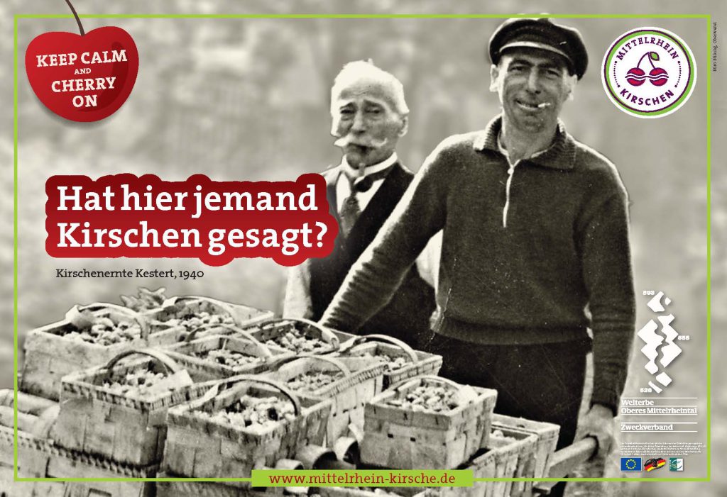 Der Zweckverband Welterbe wirbt für das schon fast vergessene rote Gold vom Mittelrhein: Kirschen. Der Oberweseler Kommunikationsdesigner Christian Büning – nebenbei einer der Macher des Gutscheinbuchs „Mittelrheintaler“ – hat mehrere Motive entwickelt, die u. a. als Plakate und Postkarten zum Einsatz kommen. Christians Kreation kombiniert das internationale Motto „Keep calm and cherry on“ mit historischen Mittelrhein-Fotos und zeitgemäßen deutschen Überschriften.