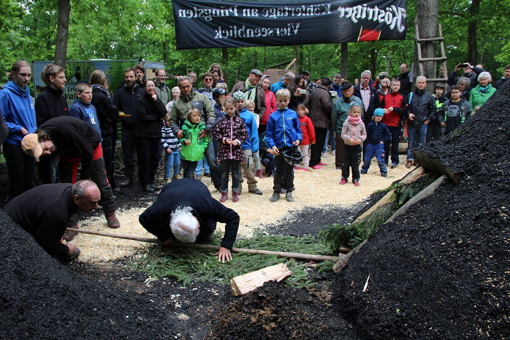 „Schwele, schwele, brenne nicht – sonst verlier ich mein Gesicht.“ Dieser alte Köhlerspruch macht klar, worum es geht: Der Meiler muss kontrolliert verkohlt werden, aber er darf nicht brennen. Sonst gibt es Asche statt Holzkohle.