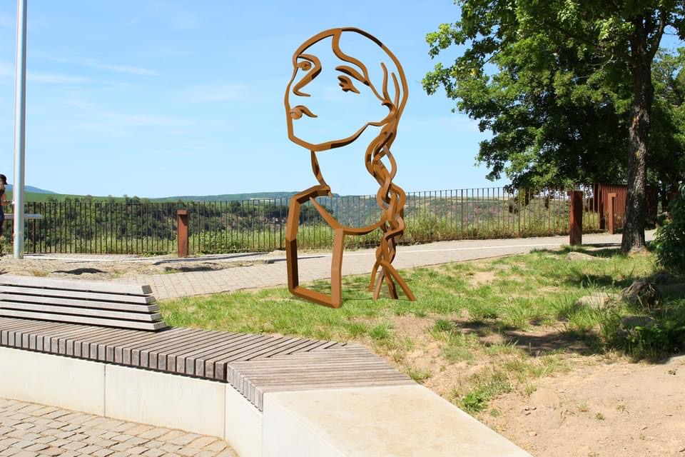Da wäre zunächst eine 3 Meter hohe Büste aus Cortenstahl (passend zum Geländer, Typ „Kunst am Bau“):